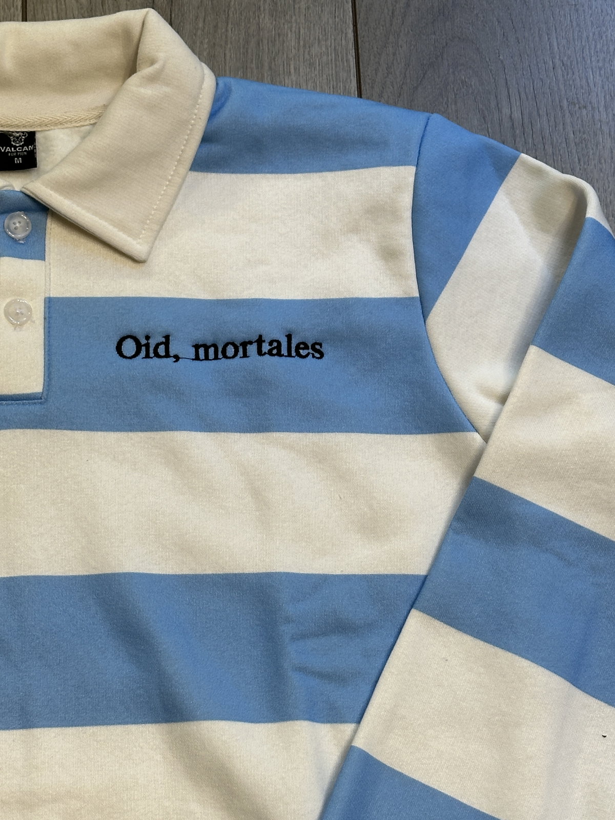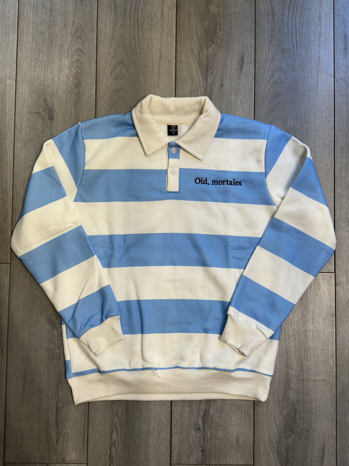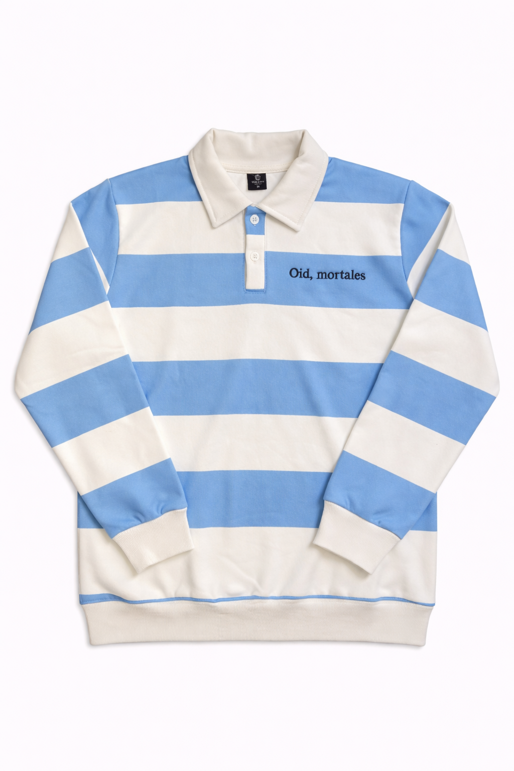 El diseño se destaca por su formato y el bordado “Oid mortales”, que le suma identidad sin recargar la prenda. Una opción versátil que combina lo clásico del cuello polo con una impronta más urbana.