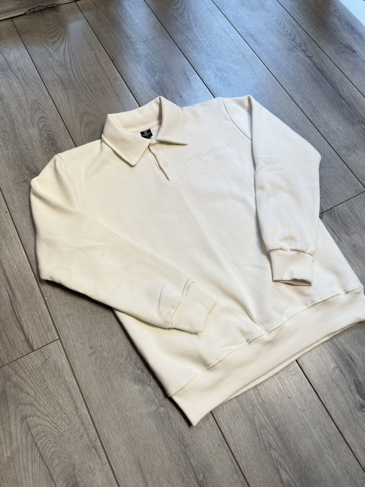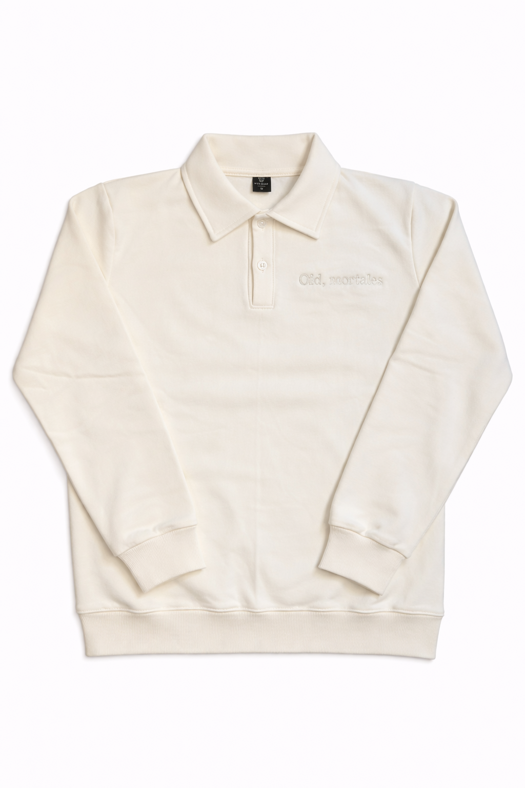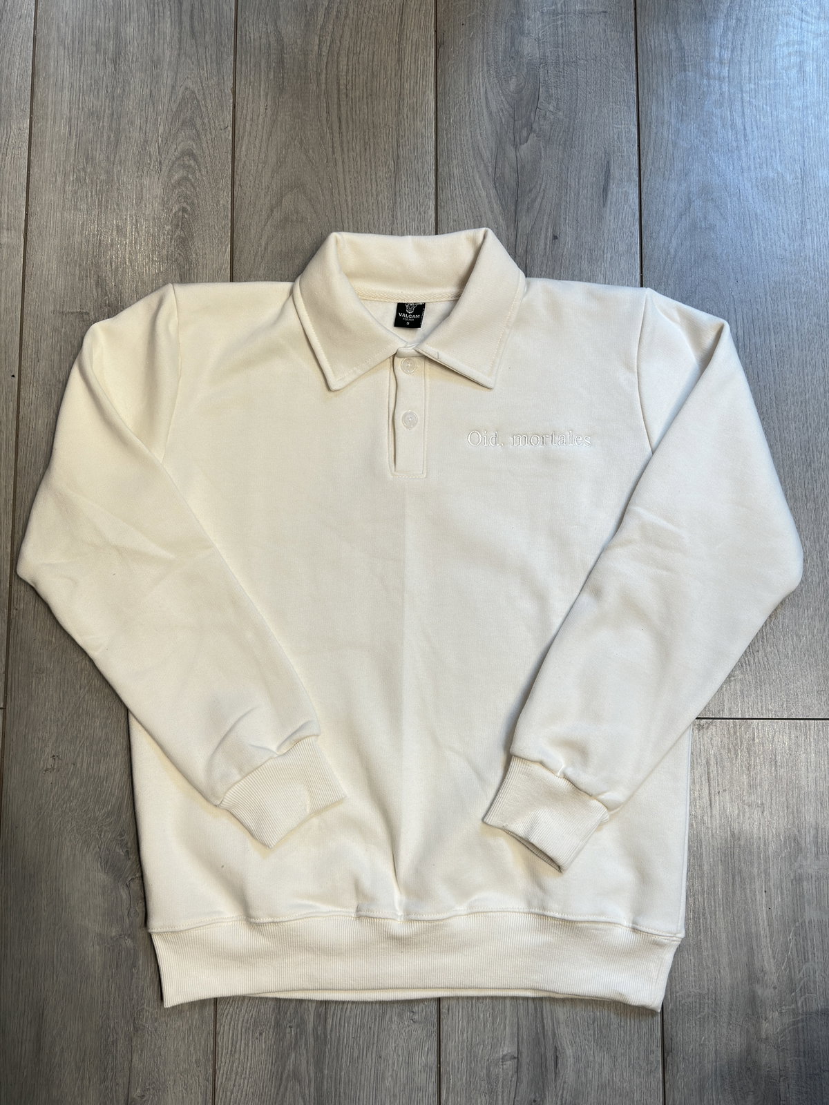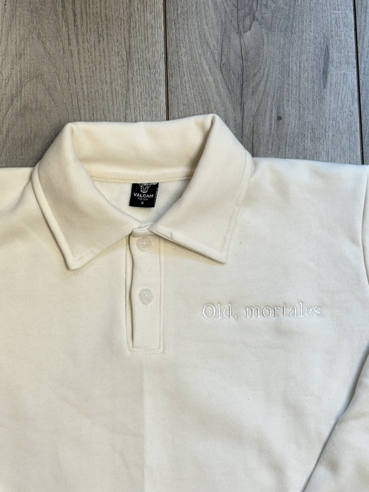 El diseño se destaca por su formato y el bordado “Oid mortales”, que le suma identidad sin recargar la prenda. Una opción versátil que combina lo clásico del cuello polo con una impronta más urbana.